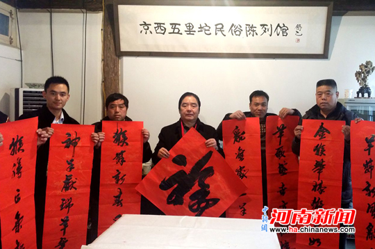 “花果飄香美哉樂土,猴年增色豈換人間;勤羊辭舊千家同喜,頑猴鬧春萬戶皆福!1月16日上午,距春節(jié)還有20余天,北京五里坨民俗陳列館內(nèi),卻是一派喜氣洋洋的節(jié)日氛圍。一副副火紅的春聯(lián),散發(fā)出濃濃的喜慶年味兒。在此,劉迅甫將近期完成的千副春聯(lián)送到了農(nóng)民工代表手中。同時,劉迅甫濃墨開寫,為來此的市民、游客送“!、送作品。