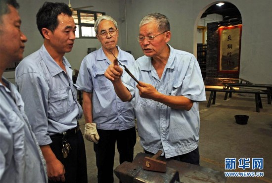 在杭州張小泉集團(tuán)手工生產(chǎn)線上,“張小泉剪刀鑲鋼鍛制技藝”傳承人施金水(右一)在介紹制剪的“打下角”工序(2010年8月20日攝)。張小泉剪刀品牌始創(chuàng)于清康熙二年(1663年),其獨創(chuàng)的72道制剪工序讓張小泉剪刀數(shù)百年長盛不衰。