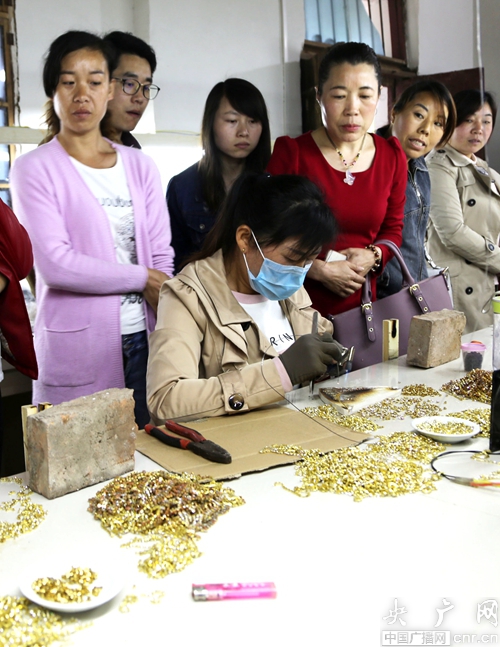 5月3日,河南寶豐13個(gè)鄉(xiāng)鎮(zhèn)、林站的婦女代表在前營(yíng)鄉(xiāng)岳墳溝村參觀學(xué)習(xí)制作鍍金胸花和首飾技術(shù)。