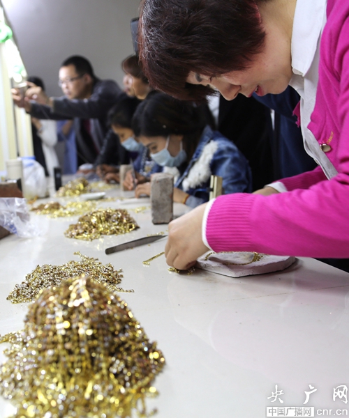 5月3日,河南寶豐前營(yíng)鄉(xiāng)岳墳溝村留守婦女在制作鍍金胸花和首飾。