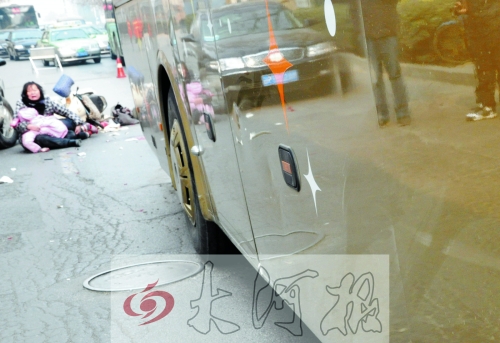昨天中午12時(shí),記者趕到事發(fā)現(xiàn)場(chǎng),只見(jiàn)道路中間的機(jī)動(dòng)車(chē)道上有幾攤血跡,在路旁的一個(gè)垃圾車(chē)?yán)锶又患诎紫嚅g的棉襖,棉襖上有斑斑血跡。肇事大巴車(chē)和被撞壞的電動(dòng)車(chē)已經(jīng)被警方拉走,小女孩的尸體也已經(jīng)被家屬拉走。