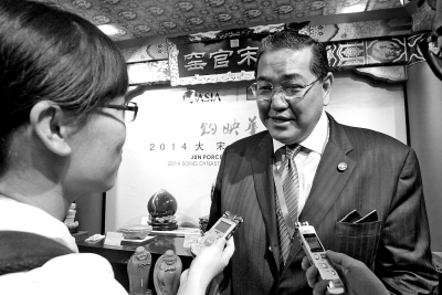 昨天下午3時許,論壇結(jié)束。泰國前副總理素拉杰走出會場,穿過大宋官窯展廳時,被媒體攔下群訪,并回答了記者的提問。