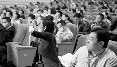 9月28日,參加論壇的與會(huì)來(lái)賓,拿出手機(jī)拍照。胡敬超攝