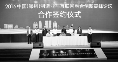 9月28日,2016中國(guó)(鄭州)制造業(yè)與互聯(lián)網(wǎng)融合創(chuàng)新高峰論壇合作簽約儀式在鄭州國(guó)際會(huì)展中心舉行。本報(bào)記者聶冬晗攝