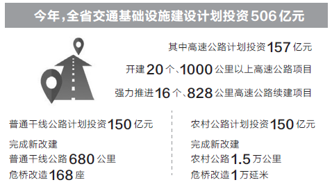 今年,全省交通基礎(chǔ)設(shè)施建設(shè)計(jì)劃投資506億元,其中高速公路計(jì)劃投資157億元。強(qiáng)力推進(jìn)16個(gè)、828公里高速公路續(xù)建項(xiàng)目。普通干線(xiàn)公路計(jì)劃投資150億元,重點(diǎn)實(shí)施低等級(jí)公路升級(jí)改造、城鎮(zhèn)過(guò)境段建設(shè),完成新改建普通干線(xiàn)公路680公里,危橋改造168座;農(nóng)村公路計(jì)劃投資150億元,完成新改建農(nóng)村公路1.5萬(wàn)公里,危橋改造1萬(wàn)延米。(記者 董娉)
