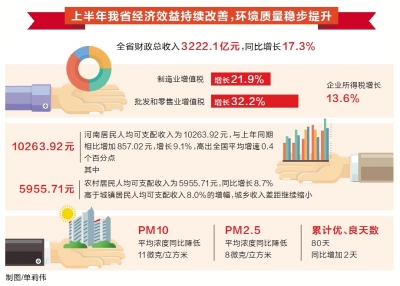 上半年河南省經(jīng)濟運行中,有兩個令人鼓舞的現(xiàn)象:“一高”——財政收入、企業(yè)效益、居民收入的增速均高于GDP增速;“一低”——全省萬元工業(yè)增加值能耗降低,藍天更多、河水更清,生態(tài)環(huán)境進一步改善。