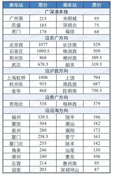 內(nèi)地部分車站至香港西九龍二等座票價表(人民幣)