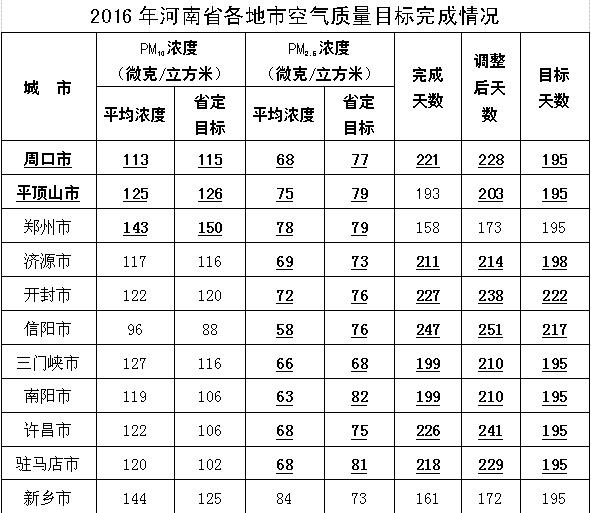 2016年的工作是在2015年因空氣質(zhì)量嚴重惡化被省環(huán)保廳約談、被環(huán)保部華北督查中心督政的極端困難情況下展開的,全市上下同心同德,背水一戰(zhàn),取得了突出成績。2016年全市空氣質(zhì)量省定責(zé)任目標:PM10126微克/立方米,PM2.579微克/立方米,優(yōu)良天數(shù)190天(年初)和195天(攻堅后)。實際完成:PM10125微克/立方米,比2015年下降(18微克/立方米)12.6%; PM2.575微克/立方米,比2015年下降(13微克/立方米)14.8%;優(yōu)良天數(shù)193天,比去年同期增加60天,優(yōu)良率52.7%。根據(jù)環(huán)保部關(guān)于沙塵暴天氣特殊處理的最新規(guī)定,平頂山市優(yōu)良天數(shù)將突破200天,超額完成目標任務(wù)。按照省大氣目標考核辦法,平頂山市大氣綜合考核位全省第3名,被省政府考核認定為3個優(yōu)秀單位之一。全省全面完成三項目標的只有周口和平頂山,完成PM10、PM2.5兩項目標的有周口、鄭州、平頂山3家(見附表)。