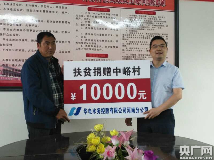 當(dāng)?shù)弥@里的村干部辦公等方面還存在很多困難,同行的華電水務(wù)控股有限公司河南分公司市場部總監(jiān)陳欣代表公司向中裕村現(xiàn)場捐贈1萬元人民幣,助力脫貧攻堅工作。