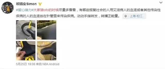 5月底,網(wǎng)上流傳圖片稱,有人在一輛共享單車的坐墊上找到一根針,似有人故意為之!膀T車的時候請注意查看,有些艾滋病患者把自己的血染到針頭上,要是被扎到你就被感染了。”