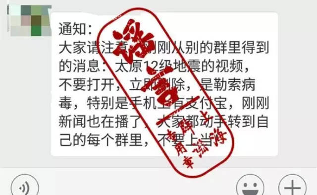 5月中旬,一則“‘太原12級地震視頻’帶有勒索病毒”的消息在微信群中大肆傳播:“大家請注意,剛剛從別的群里得到的消息:太原12級地震的視頻,不要打開,立即刪除,是勒索病毒,特別是手機上有支付寶的。剛剛新聞也在播了,大家都動手轉到自己的每個群里,不要上當。”
