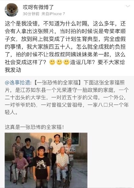 真相:照片中這位“唯一”的年輕人@哎呀有微博了 通過個人微博辟謠表示,家中并不是僅有這幾個人,自己還有兄弟姐妹、叔叔阿姨,整個家族加起來有四五十人。至于這張照片,是幾年前為了宣傳孝順老人而配合拍攝,沒讓其叔叔阿姨妹妹弟弟出鏡。
