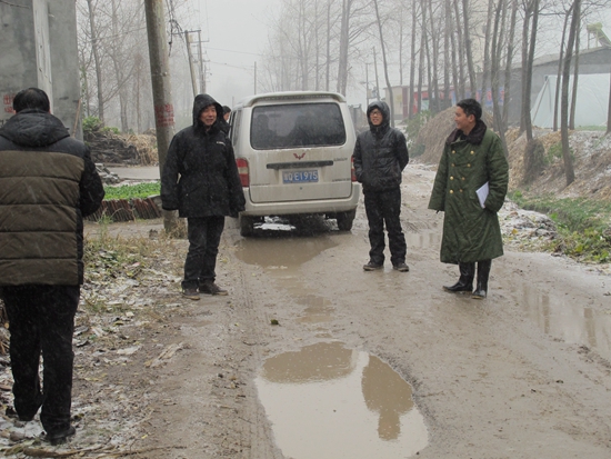 圖片說明:2015年11月份陳召起(右一)與村兩委班子成員冒雪入戶走訪以精準(zhǔn)核實(shí)貧困戶