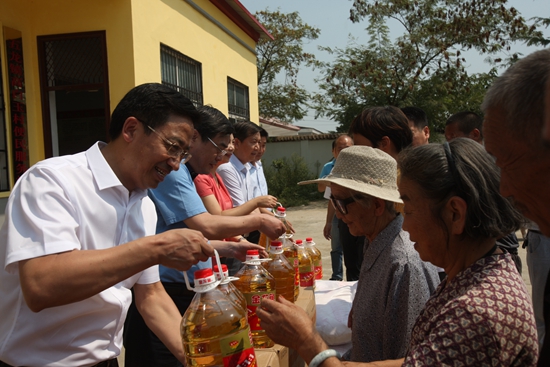 圖片說明:2016年9月10日河南省人民醫(yī)院院長顧建欽(左一)、黨委書記邵鳳民(左二)帶領(lǐng)醫(yī)院領(lǐng)導(dǎo)班子成員到高白玉村調(diào)研指導(dǎo)駐村扶貧工作的同時(shí),慰問村內(nèi)特殊群體