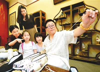 在日前舉行的第五屆京交會上,內(nèi)聯(lián)升第五代傳承人蔡文科現(xiàn)場演示制作手工布鞋,吸引了眾多游客。細細麻繩手中過,一雙“一”字底布鞋每平方寸需要不多不少地納上81針,整雙鞋至少2100針。