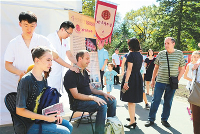 2017年9月16日,塞爾維亞首都貝爾格萊德市民在體驗同仁堂醫(yī)師的按摩。
