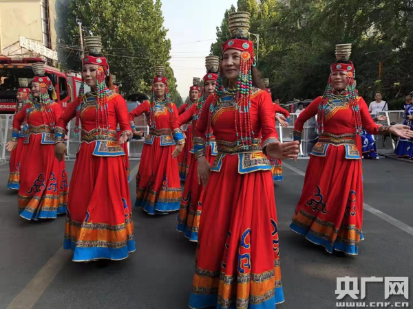 除了形式多樣的歡迎方式,現(xiàn)場群眾還準(zhǔn)備了豐富多彩的文藝演出,杜嶺街道辦事處紅日文化藝術(shù)團(tuán)的演員們身著華麗的蒙古服飾,跳著歡快的蒙古族舞蹈《盅碗筷》,以飽滿的熱情迎接火炬手們的到來。