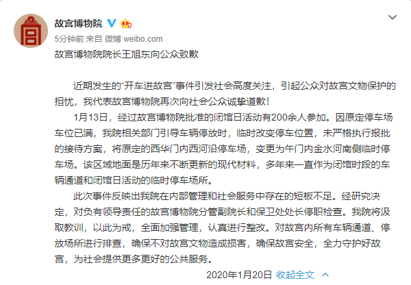 央視網(wǎng)消息:1月21日,針對(duì)近期發(fā)生的“開車進(jìn)故宮”事件,故宮博物院院長王旭東在微博發(fā)出致歉聲明,全文如下: