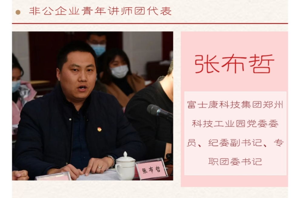 富士康科技集團鄭州科技工業(yè)園專職團委書記、鄭州青年講師團成員張布哲把多年來從事基層團建和青年工作對共青團的理解概括成三句話:“共同的信仰,青年的夢想,團結(jié)的力量”,面對基層青年“2035,中國是什么樣?自己是什么樣?”的憧憬之問,他總是通過頭腦風(fēng)暴和上臺分享,再結(jié)合全會勾畫的明確藍圖,讓青少年更加直觀的理解遠景目標(biāo),互動參與式的課程得到大家的認可。他說:“開啟新征程,你我皆是趕路人。作為青年講師團成員,我們一要學(xué)深悟透會議精神,結(jié)合鄭州未來發(fā)展規(guī)劃,持續(xù)學(xué)習(xí)宣傳貫徹好黨的十九屆五中全會精神,將會議精神快速傳達給廣大青少年;二要學(xué)以致用,引導(dǎo)廣大青少年在鄭州發(fā)展新征程中找準(zhǔn)定位,做好職業(yè)發(fā)展規(guī)劃,立足自身,敢于擔(dān)當(dāng),勇于作為,積極投身全面建設(shè)社會主義現(xiàn)代化國家的偉大實踐!