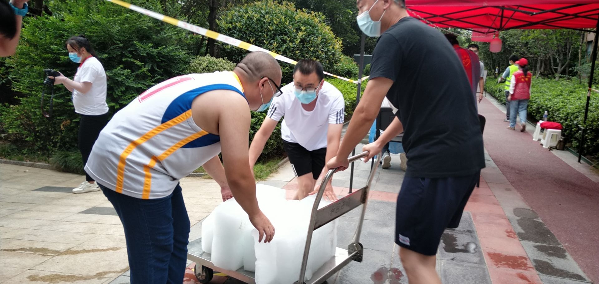 烈日炎炎,核酸檢測(cè)醫(yī)護(hù)人員身穿厚重的防護(hù)服,連坐數(shù)時(shí),不免要汗流浹背。青年志愿者以及熱心居民為社區(qū)核酸檢測(cè)人員送去冰塊以及冰凍礦泉水,為大家?guī)?lái)一絲清涼,送的是冰塊,暖的是人心。