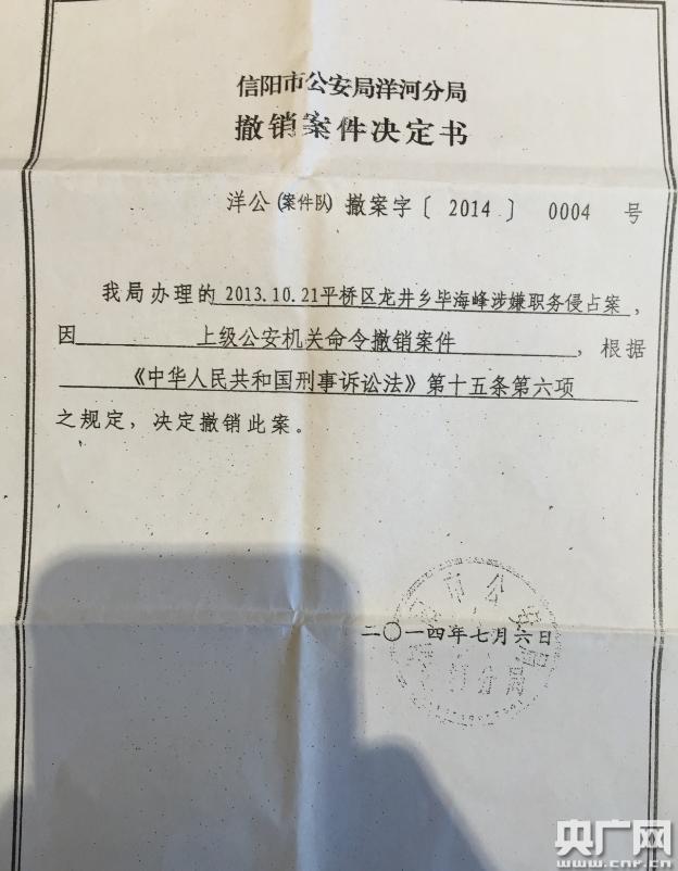 但報(bào)案人吳作新沒有想到,2014年7月,信陽市公安局洋河分局發(fā)出了《撤銷案件決定書》。
