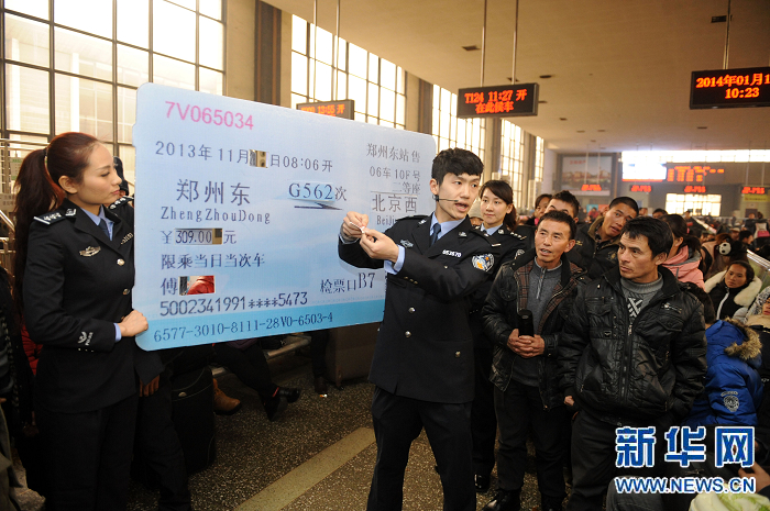 1月15日,鄭州鐵路公安處民警在鄭州火車站候車大廳指導(dǎo)旅客辨別火車票真?zhèn)巍?/p>