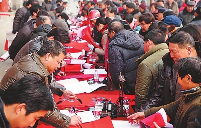 1月16日,中國書協(xié)、河南省書協(xié)書法家來到古城社旗縣賒店鎮(zhèn),為當?shù)鼐用衩赓M書寫春聯(lián),把“!彼偷桨傩占抑。(張林 攝)