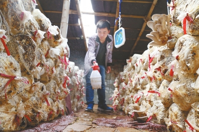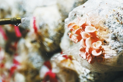 隨后,記者在王冬冬的帶領(lǐng)下進(jìn)入了食用菌大棚,只見里面密密麻麻地?cái)[滿了菌袋,幾名大學(xué)生正在往棚里噴水以增加濕度。采訪中,菌袋上粉色的平菇吸引住了記者!斑@是我們自己培育的新品種,具有觀賞性和食用性,而且比一般平菇口感更好,目前市場(chǎng)上還沒有此品種。”王冬冬告訴記者。