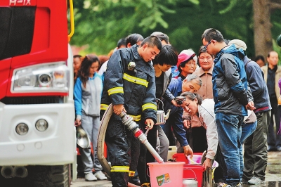 ①蘭州市民在排隊打水。