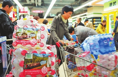蘭州市一些市民從11日中午開始前往超市和商鋪搶購礦泉水、桶裝水等飲用水。蘭州市正組織保障好瓶裝水貨源的供應。