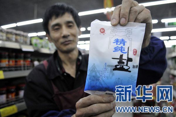 4月21日,在河南鄭州市黃河路上一處超市內(nèi),工作人員展示出售的食鹽。