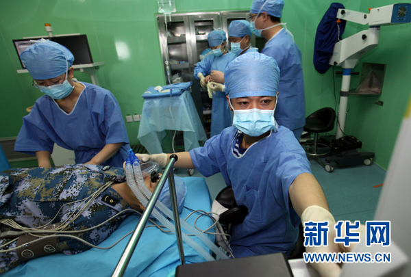 4月23日,和平方舟醫(yī)院船人員對“傷員”進(jìn)行手術(shù)。 新華社發(fā) 黃育平 攝
