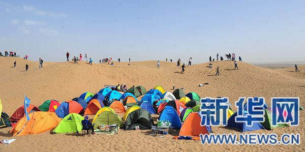 5月1日,在寧夏兵溝景區(qū)的沙漠中,大批游客扎帳篷夜宿沙漠。