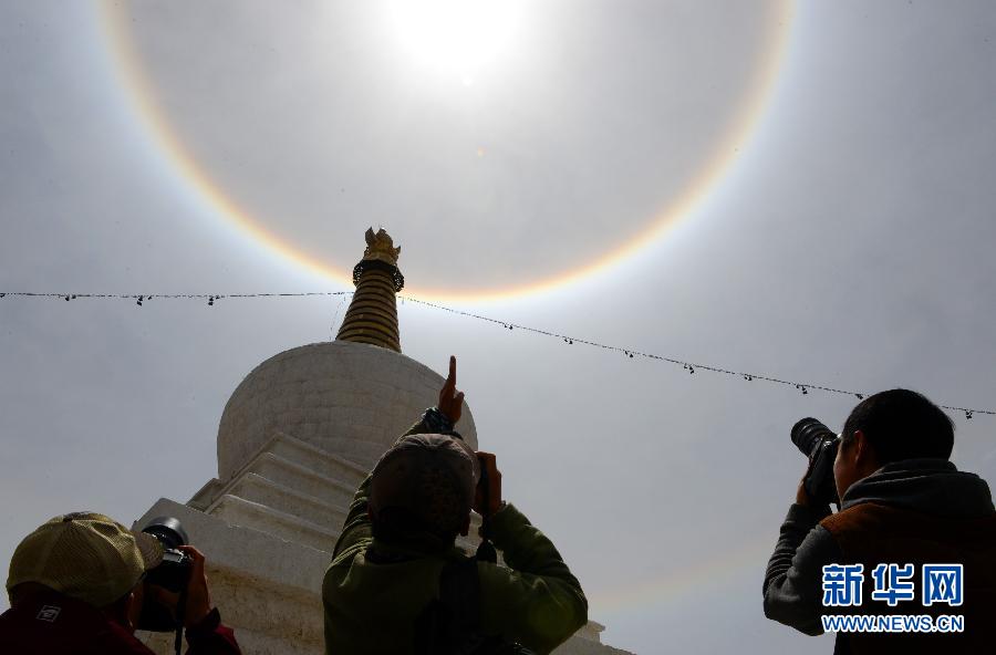 央廣網(wǎng)河南分網(wǎng)消息 據(jù)新華網(wǎng)報(bào)道:當(dāng)日,西藏拉薩上空出現(xiàn)日暈景觀。日暈是一種大氣光學(xué)現(xiàn)象,是日光通過卷層云時(shí),受到冰晶的折射或反射而形成的。當(dāng)光線射入卷層云中的冰晶后,經(jīng)過兩次折射,分散成不同方向的各色光。新華社記者 覺果 攝