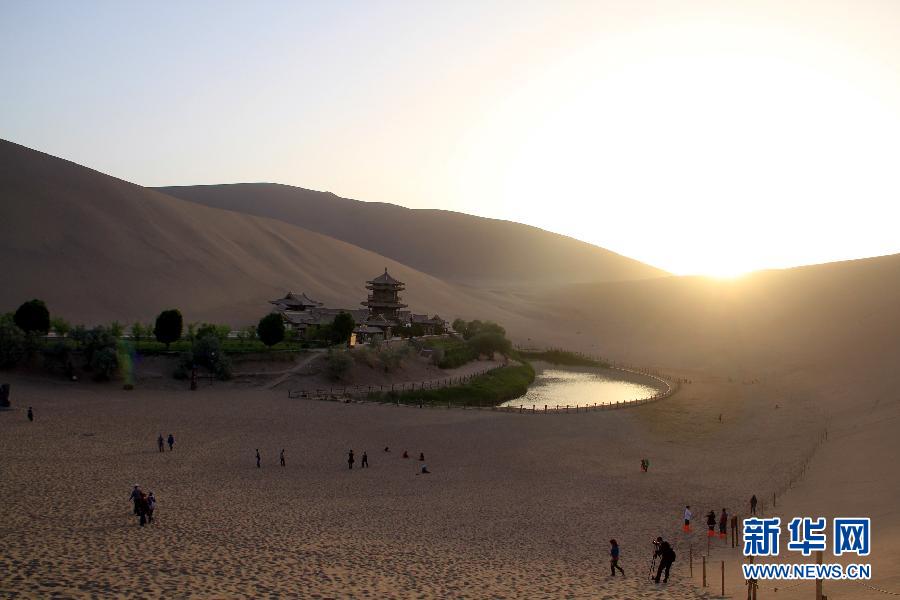 中外游客乘興游夕陽(yáng)下的甘肅省敦煌市鳴沙山月牙泉顯得更加迷人。(5月18日攝)