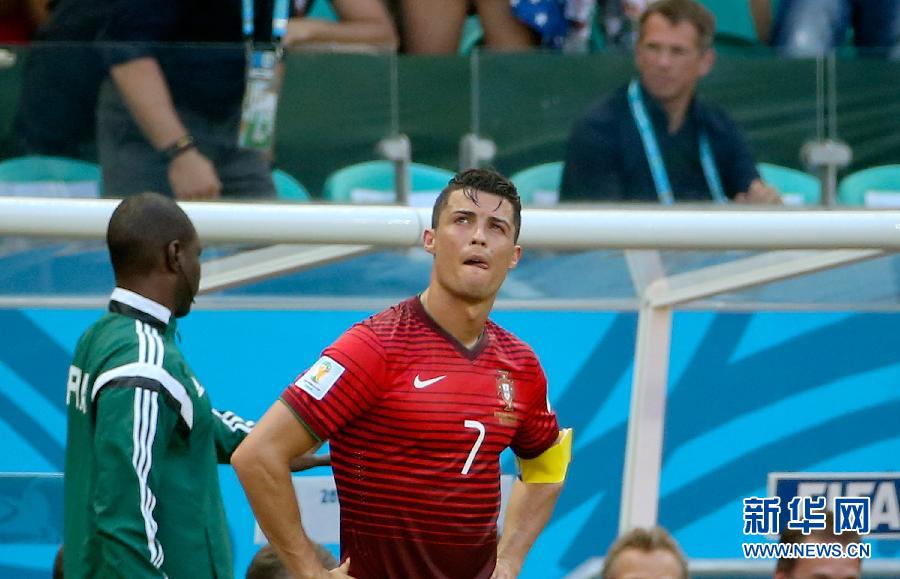 6月16日,葡萄牙隊球員克·羅納爾多在球隊丟球后表情沮喪。當日,在巴西薩爾瓦多新水源競技場進行的2014年巴西世界杯小組賽G組比賽中,葡萄牙隊以0比4不敵德國隊。 新華社記者曹燦攝