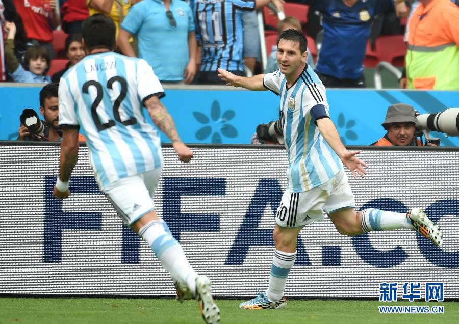 6月25日,阿根廷隊球員梅西慶祝任意球得分。當日,在巴西阿萊格里港河濱球場進行的2014年巴西世界杯小組賽F組比賽中,尼日利亞隊對陣阿根廷隊。(新華社記者李尕攝)