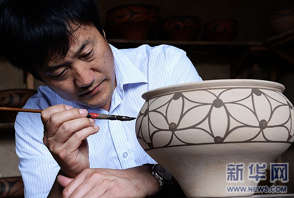 7月1日,楊拴朝在仰韶彩陶坊進(jìn)行彩繪。