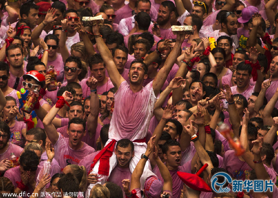 當?shù)貢r間2014年7月6日,西班牙潘普洛納,來自世界各地的狂歡者參加奔牛節(jié)開幕儀式。