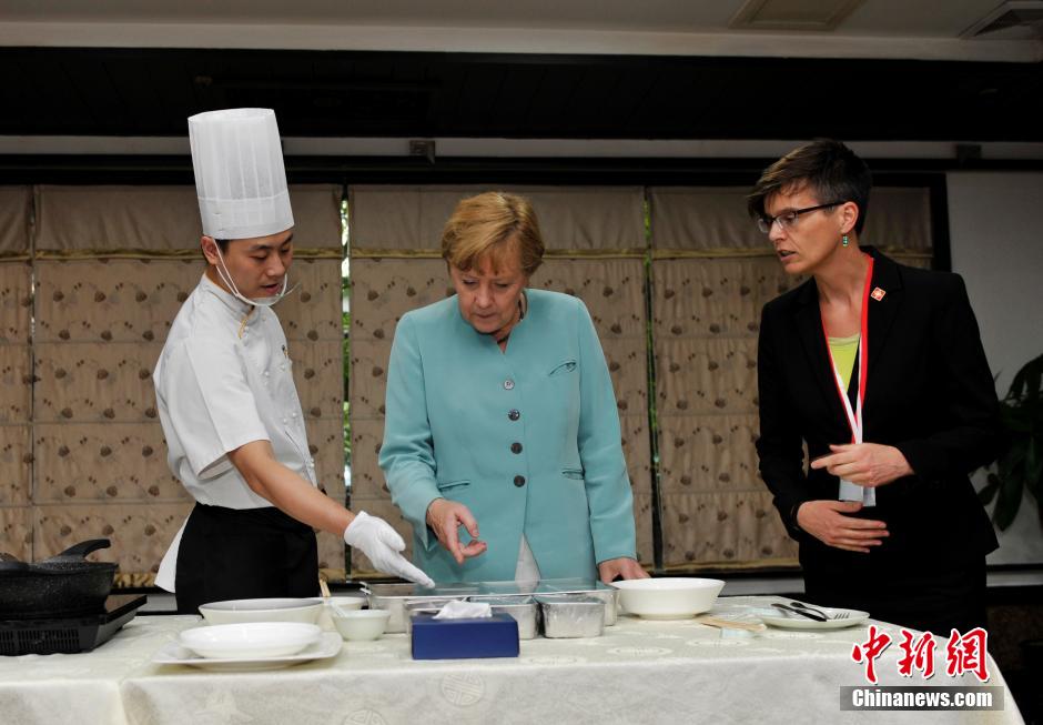 7月6日,應(yīng)中國(guó)國(guó)務(wù)院總理李克強(qiáng)邀請(qǐng),德意志聯(lián)邦共和國(guó)總理安格拉·默克爾開(kāi)始訪問(wèn)中國(guó)。位于中國(guó)西部地區(qū)的四川省成都市是其訪華的第一站。圖為默克爾向川菜大廚學(xué)習(xí)宮保雞丁的做法。中新社發(fā) 安源 攝