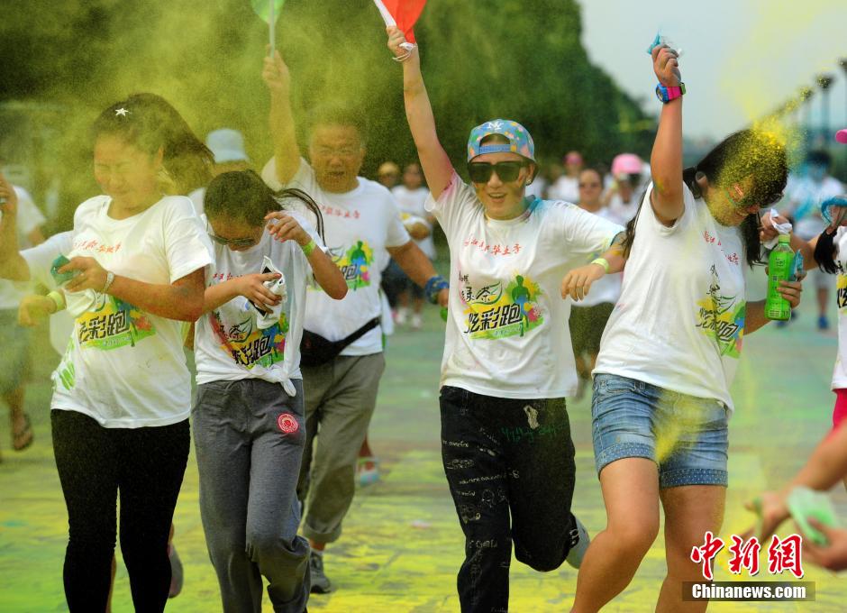 央廣網(wǎng)河南分網(wǎng)消息 據(jù)中新網(wǎng)報道:7月13日,上千武漢市民齊聚武漢漢口江灘參加5公里炫彩跑運動,他們一路邊跑邊走邊嬉戲,時時開懷大笑。跑步距離為5公里,每公里設置一個彩色站,當選手跑步或步行至彩色站時,由工作人員及志愿者向參與者拋灑彩色粉末。炫彩跑是一項娛樂項目,它融合了跑步和色彩,與傳統(tǒng)跑步競速相比,更強調“參與、娛樂和色彩”的重要性。(中新社發(fā) 張暢 攝)