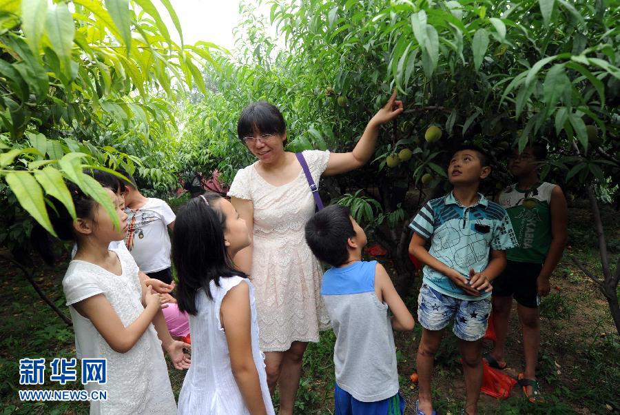 7月17日,在河北廊坊廣陽(yáng)區(qū)南尖塔鎮(zhèn)果園中,家長(zhǎng)在給孩子們講授桃樹的相關(guān)知識(shí)。