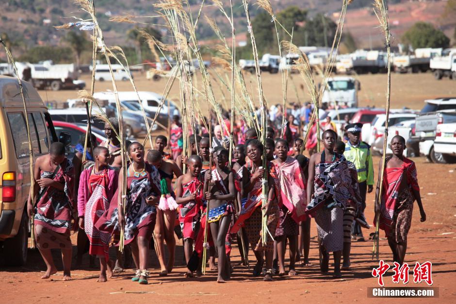 2014年8月27日至9月2日,南部非洲國家斯威士蘭舉行一年一度的“蘆葦節(jié)”選秀女活動。近10萬名未婚處女手持蘆葦,袒胸露乳,伴隨著音樂翩翩起舞,接受國王姆斯瓦蒂三世的遴選。一旦被國王選中,這些少女將獲得數(shù)十頭牛的厚重聘禮,并有望改變自己家族的命運。目前,姆斯瓦蒂三世已經(jīng)納有14位妃子。張楷 攝