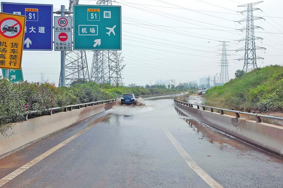 連續(xù)降雨已過去1周,但鄭州仍有地方積水嚴(yán)重,積水深達(dá)30厘米。9月24日早上,在鄭州由南三環(huán)上機場高速的匝道處,因積水較深較多,宛如一條小河,至少3輛汽車到此被“嗆”熄火。但對此事,鄭州多個部門均稱不歸其管理。(記者 張朝 文 平偉 攝影)