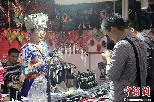 圖為鄭交會(huì)上,苗族商家身著民族服裝吸引顧客。馬義恒 攝