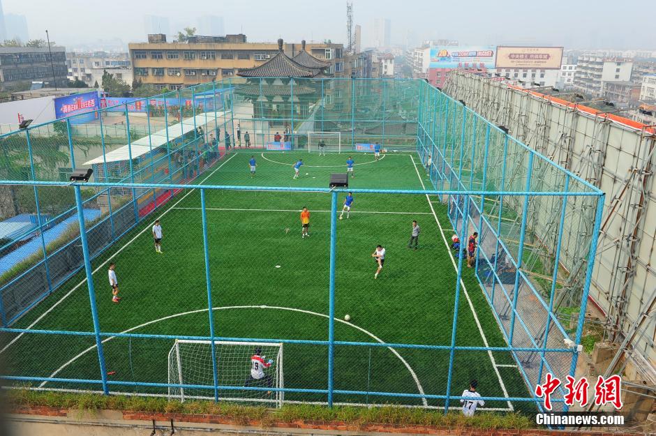 央廣網(wǎng)河南分網(wǎng)消息 據(jù)中國新聞網(wǎng)報道:10月12日,一些足球愛好者們在安徽省阜陽市古商城北門樓頂上建起的“空中足球場”里踢足球。日前,阜陽市出現(xiàn)首個樓頂“空中足球場”,這個足球場位于當?shù)毓派坛潜贝箝T20米高的空閑樓頂,長度38米,寬為18米,總占地約2000平方米,球場內(nèi)鋪了草坪,場地兩端各有一個球門,球場周圍和上空都安裝了監(jiān)控攝像頭及護網(wǎng),以確保足球不會被踢飛下樓。中新社發(fā) 王彪 攝 圖片來源:CNSPHOTO