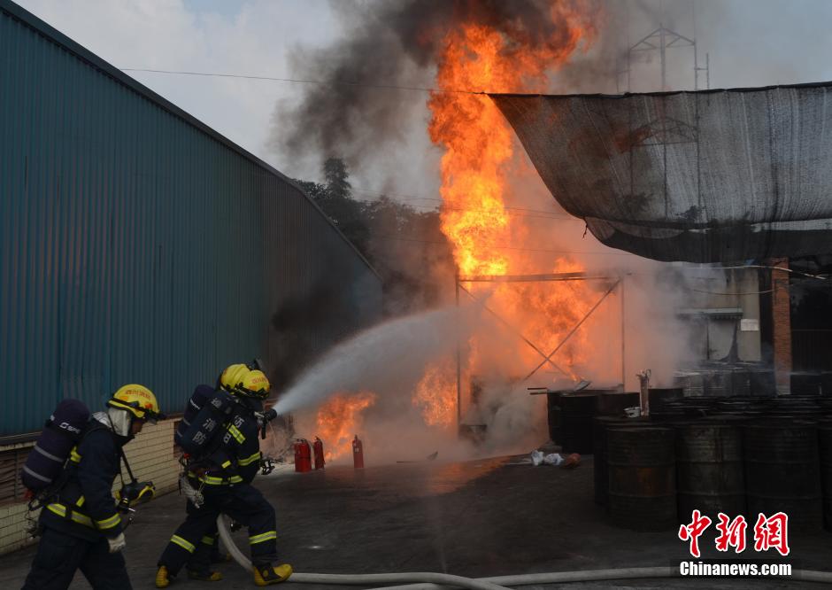 10月20日,四川綿陽市一飼料廠發(fā)生火災(zāi),位于露天油脂灶上的6個裝滿豬油的油桶猛烈燃燒,火焰達(dá)到5米多高,起火點左側(cè)是一棟放著大量糧食的倉庫,右側(cè)還存放著十余桶豬油,隨時都有引起大面積燃燒的可能。綿陽市119指揮中心接到報警后,立即調(diào)派特勤中隊趕赴現(xiàn)場處置。經(jīng)過消防官兵的奮力撲救,大火被成功撲滅。 中新社發(fā) 田猛 攝