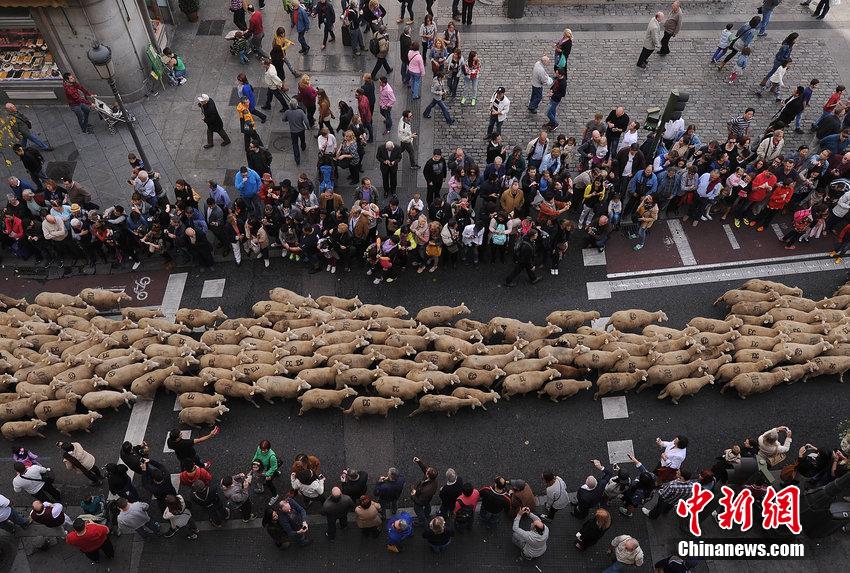 當(dāng)?shù)貢r間2014年11月2日,西班牙馬德里,2000只羊穿過城市中心大街,呼吁加強(qiáng)對季節(jié)性牲畜遷移古道的保護(hù)工作。圖片來源:CFP視覺中國