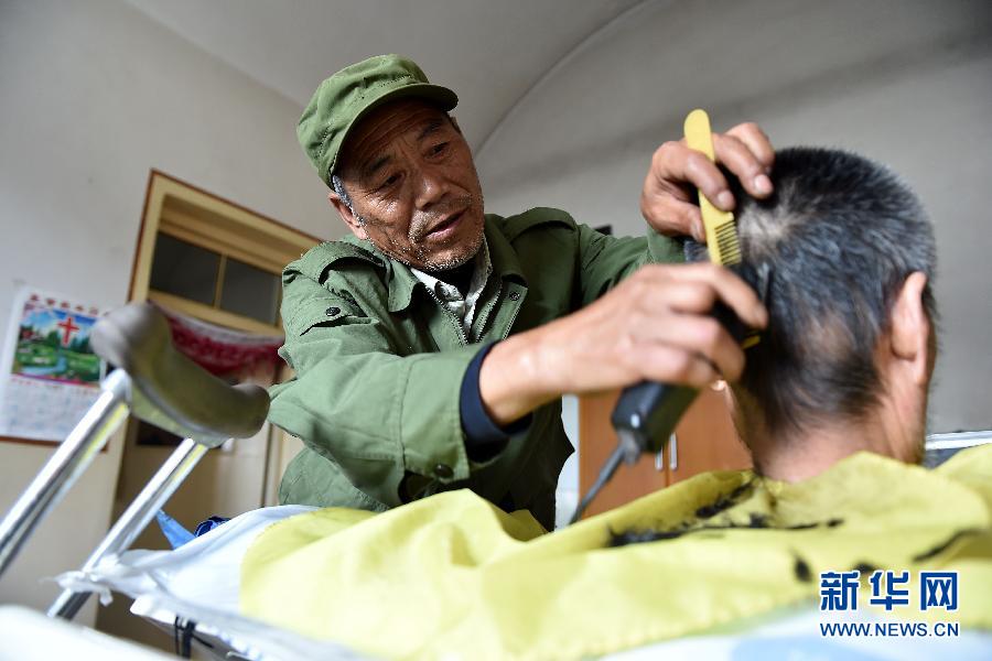 央廣網(wǎng)河南分網(wǎng)消息 據(jù)新華網(wǎng)報(bào)道:11月3日,李來生在為一位村民理發(fā)。今年63歲的李來生是山西省孝義市東莊村人,自1975年退伍后,每天堅(jiān)持為村里的孤寡老人、行動不便的村民免費(fèi)理發(fā),雖然1980年他因病失去一條腿,但30多年來,李來生的義務(wù)理發(fā)從未間斷。 20世紀(jì)70年代,李來生在部隊(duì)當(dāng)兵,見老兵去敬老院為老人義務(wù)理發(fā),便萌生學(xué)理發(fā)念頭。一位老兵對李來生說,教你可以,但你學(xué)會了還要堅(jiān)持為老人義務(wù)理發(fā)。李來生當(dāng)時(shí)就做了一個(gè)承諾:一定堅(jiān)持為有需要的人義務(wù)理發(fā)。此后的日子里,李來生用行動恪守著自己的承諾!班l(xiāng)里鄉(xiāng)親的,上門為他們理發(fā),也能和他們聊聊天! 李來生說:“只要我還能走,我就會堅(jiān)持做下去。” 日前,李來生被山西省孝義市評為“孝義好人”。 新華社記者 詹彥攝