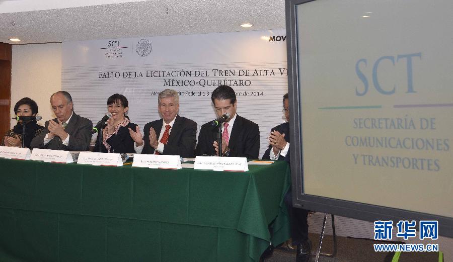 央廣網(wǎng)河南分網(wǎng)消息 據(jù)新華網(wǎng)報(bào)道:11月3日,墨西哥通信和交通部長(zhǎng)魯伊斯·埃斯帕薩(左四)等人在首都墨西哥城出席新聞發(fā)布會(huì)。北京時(shí)間11月4日凌晨,墨西哥通信和交通部宣布,由中國(guó)鐵建牽頭的國(guó)際聯(lián)合體中標(biāo)墨西哥國(guó)內(nèi)首條高鐵——墨西哥城至克雷塔羅高速鐵路項(xiàng)目。這是中國(guó)在海外設(shè)計(jì)、承建并完全采用中國(guó)標(biāo)準(zhǔn)和裝備的首條時(shí)速300公里高鐵,是中國(guó)高鐵“走出去”真正意義上的“第一單”。新華社發(fā)(墨西哥通信和交通部提供)